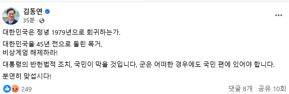 그러면서 "대한민국은 정녕 1979년으로 회귀하는가. 대한민국을 45년 전으로 돌린 폭거, 비상계엄 해제하라. 분연히 맞서자"고 덧붙였다.