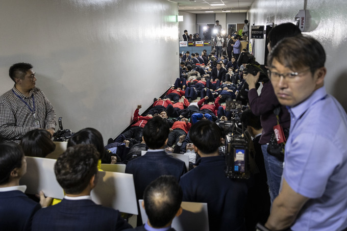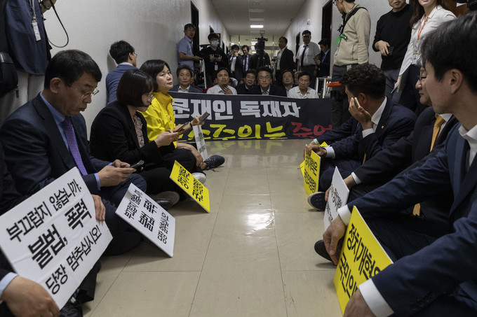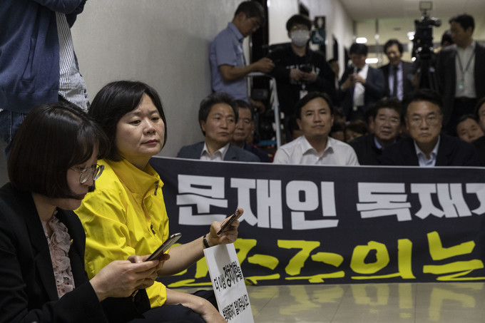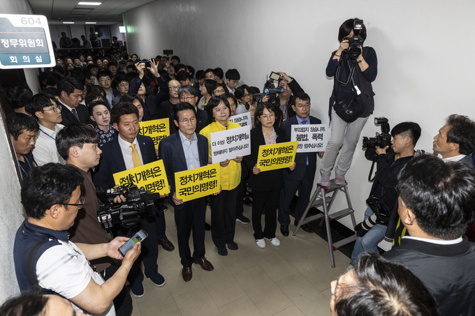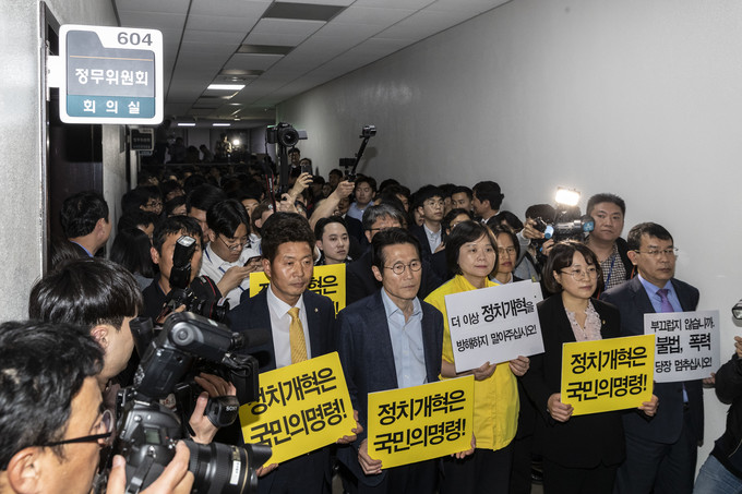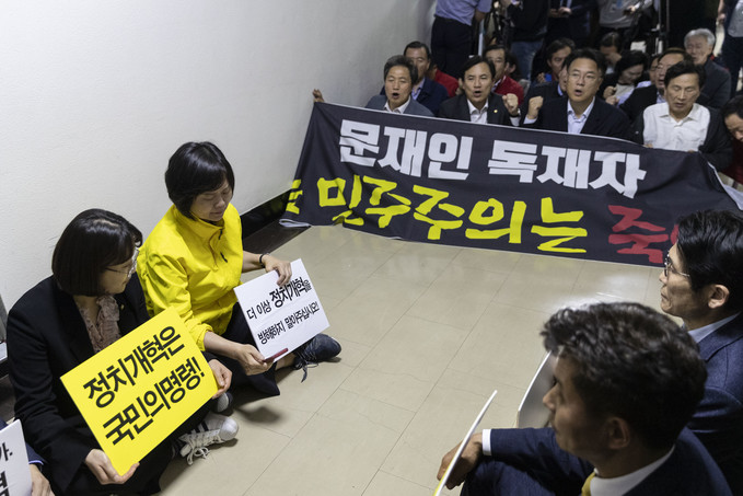 이정미 정의당 대표와 윤소하 원내대표가 29일 저녁 선거제도 개혁 패스트트랙 지정을 위한 정치개혁특별위원회 전체회의가 열리는 국회 정무위회의실 앞에서 손피켓을 들고 자유한국당과 대치하고 있다.