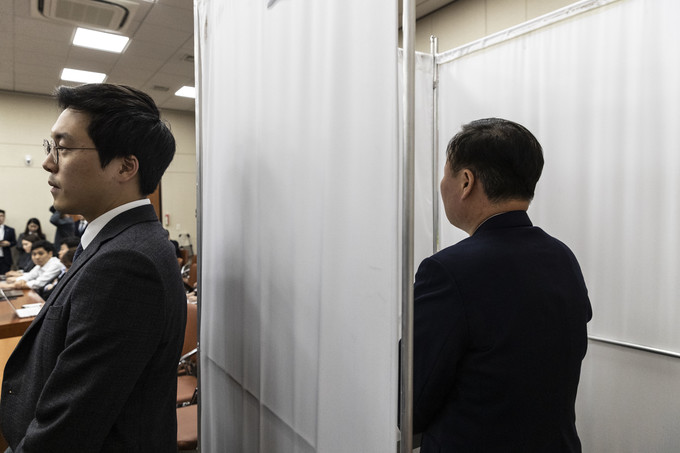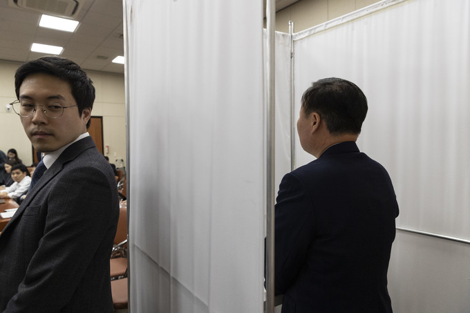 29일 밤 시작된 정치개혁특별위원회 전체회의가 자정을 넘긴 가운데 김재원 자유한국당 의원(오른쪽)이 기표소에서 투표를 하고 있다.
