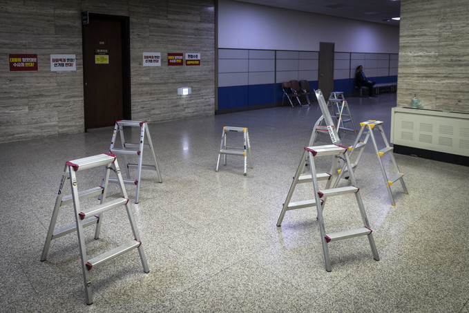 국회 사법개혁특별위원회와 정치개혁특별위원회가 선거제 개혁안과 공수처법·검경수사권 조정안을 패스트트랙에 지정한 30일 새벽 국회 사법개혁특별위원회 회의장(제5회의장) 문앞 복도에 열띤 사진 취재 경쟁을 벌이는데 동원됐던 키높이 사다리들만이 덩그러니 남아 있다.