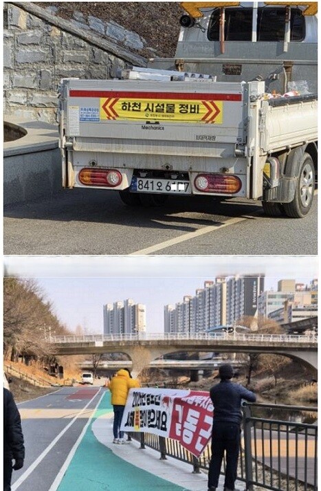 | ▲지난 3일 의정부시 금오동 부용천에서 하천시설물정비 스티커를 붙인 차량으로 산책로에 무단 진입한 작업자들이 김동근 시장의 새해 인사 현수막을 걸고 있다. [경기북부시민신문 제공] |