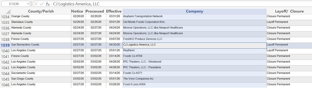 | ▲ 미국 캘리포니아주 고용개발국(EDD)에 접수된 WARN 보고서 목록에 CJ로지스틱스 해고 통지 내용이 포함됐다. [미국 캘리포니아 고용개발국 제공] |