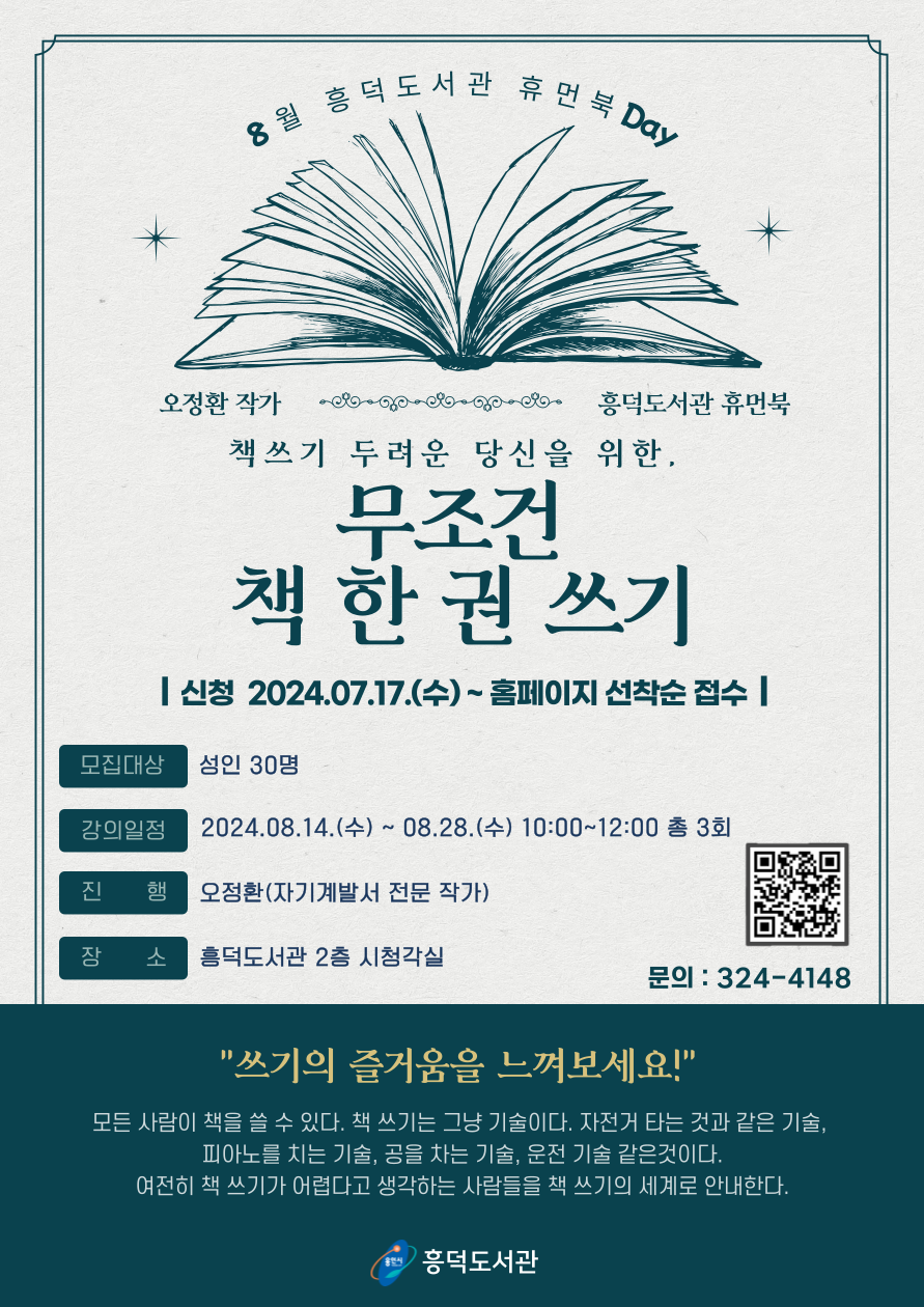 용인시는 오는 14~28일 흥덕도서관 2층 시청각실에서 '무조건 책 한 권 쓰기'를 주제로 오정환 작가를 초청해 '휴먼북 데이'를 운영한다고 5일 밝혔다.
