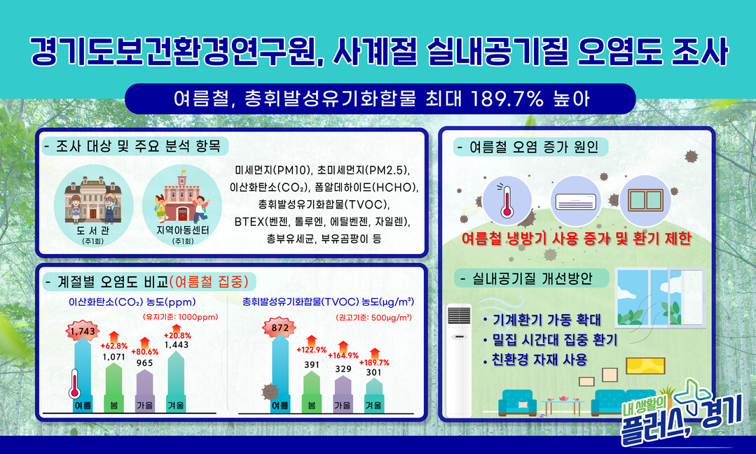 경기도보건환경연구원이 도서관과 지역아동센터의 사계절 실내 공기질을 조사한 결과, 여름철에 이산화탄소(CO₂)와 총휘발성유기화합물(TVOC) 농도가 가장 높은 것으로 나타났다.