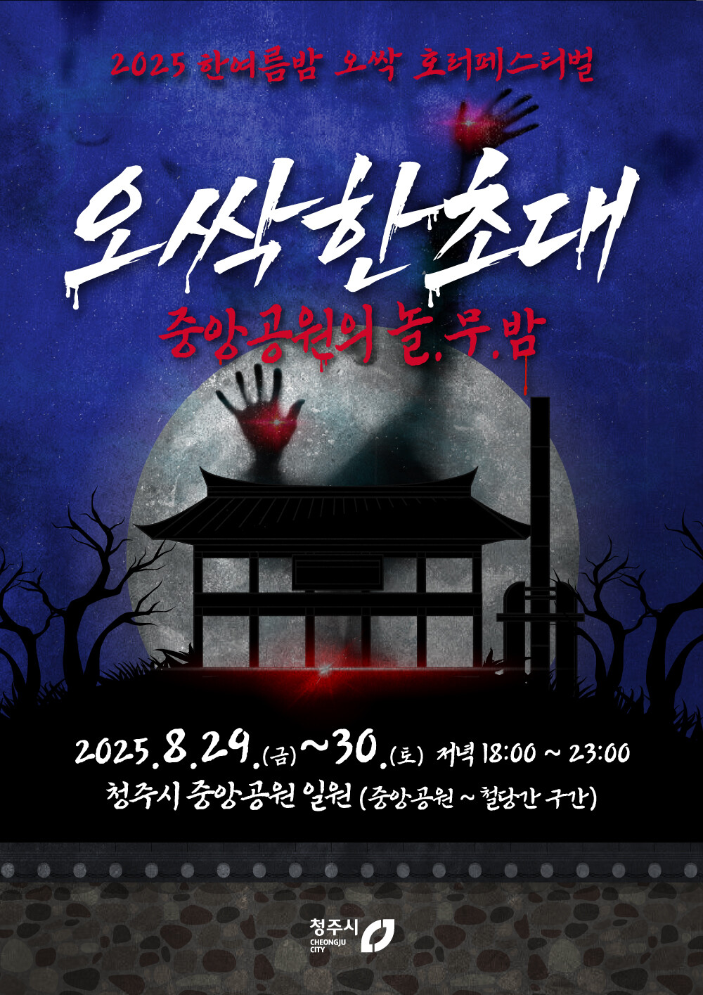 올해 처음 선보이는 청주형 K-호러 축제 '한여름밤의 오싹 호러 페스티벌'은 8월 29일부터 30일까지 이틀간 중앙공원~철당간에서 열린다. 귀신과 함께하는 호러 미션 투어, 호러 퍼레이드, 호러 매직쇼, 호러 코스프레 대회 등 다양한 참여형 프로그램을 통해 시민과 만난다.