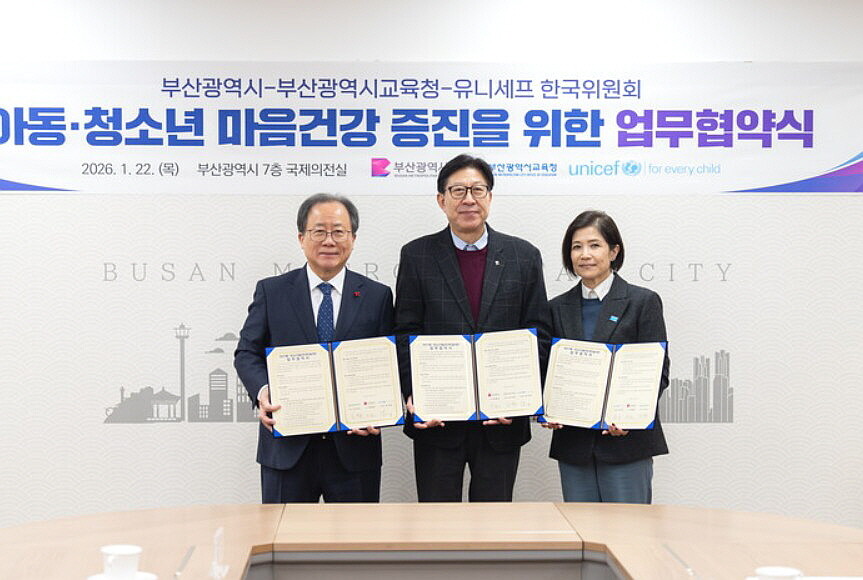 | ▲ 올해 1월 22일 박형준 시장과 김석준 시교육감이 조미진 유니세프 한국위원회 사무총장과 함께 아동·청소년 마음건강 증진 업무협약을 맺은 뒤 기념촬영을 하고 있다. [부산시교육청 제공] |