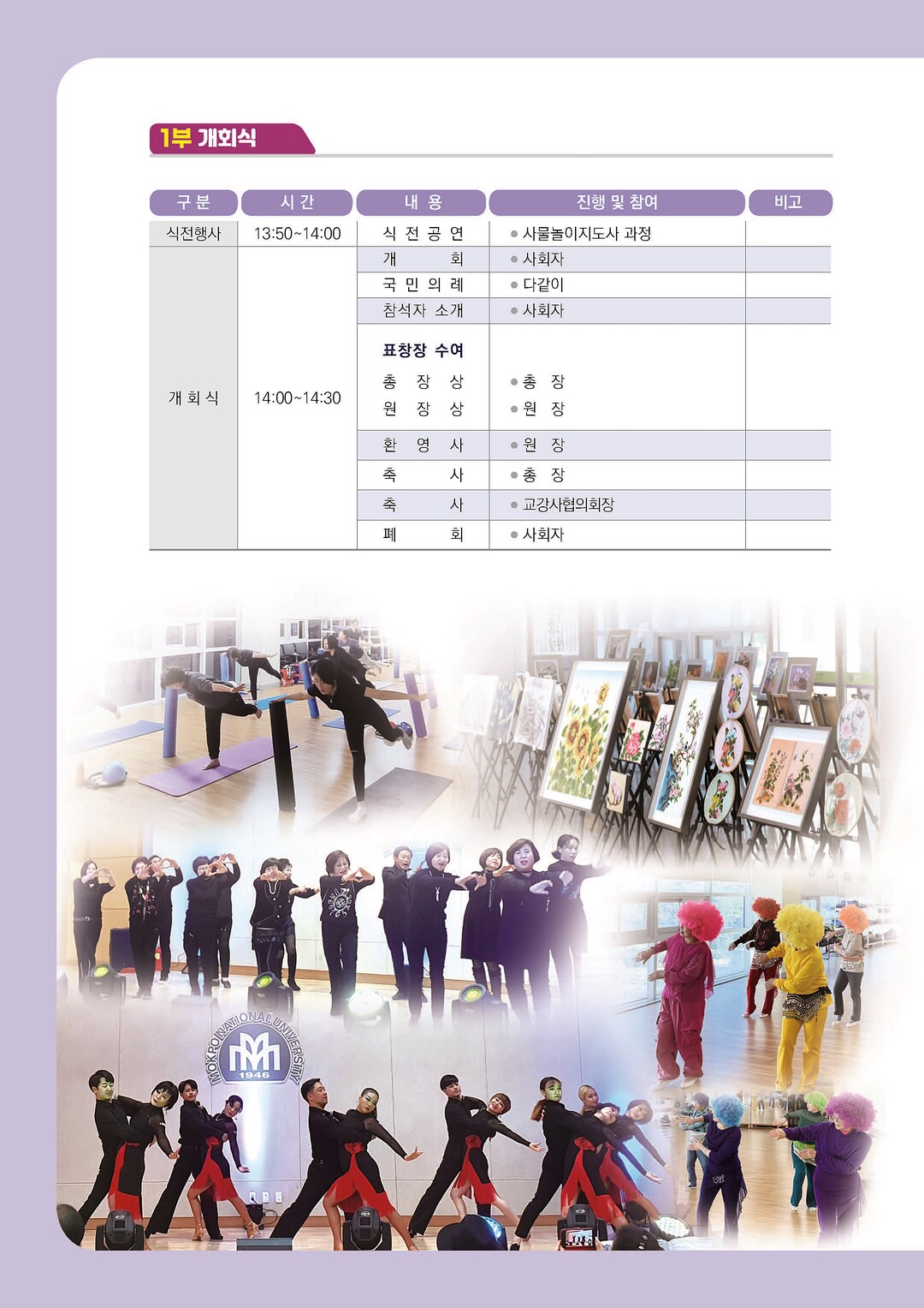 이번 축제는 사물놀이지도사 과정의 식전공연으로 문을 열며, 개막식에서는 목포대 총장상 등 평생학습 유공자에 대한 시상식이 진행된다. 또 시니어 모델 워킹과정의 모델 워킹시범 공연 등 18개 팀의 공연과 서예를 비롯한 14개 과정의 작품전시, 행운 이벤트 행사가 다채롭게 펼쳐진다.