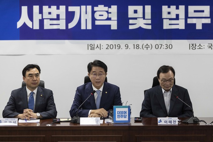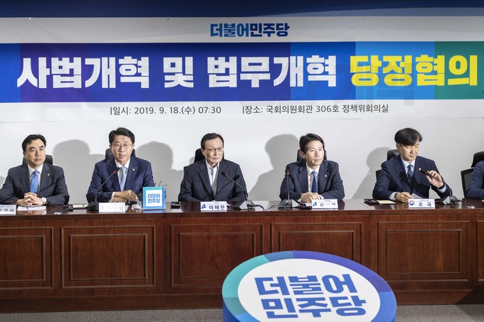 더불어민주당 조정식 정책위의장(왼쪽 두번째)이 18일 오전 서울 여의도 국회에서 열린 '사법개혁 및 법무개혁 당정협의'에 참석해 발언하고 있다.