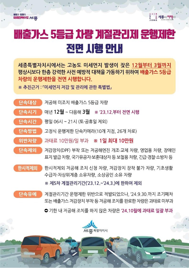 세종시가 1일부터 내년 3월 31까지 '제5차 미세먼지 계절관리제' 기간 동안 미세먼지 저감을 위해 세종시 전역에서 배출가스 5등급 차량의 운행을 전면 제한한다.