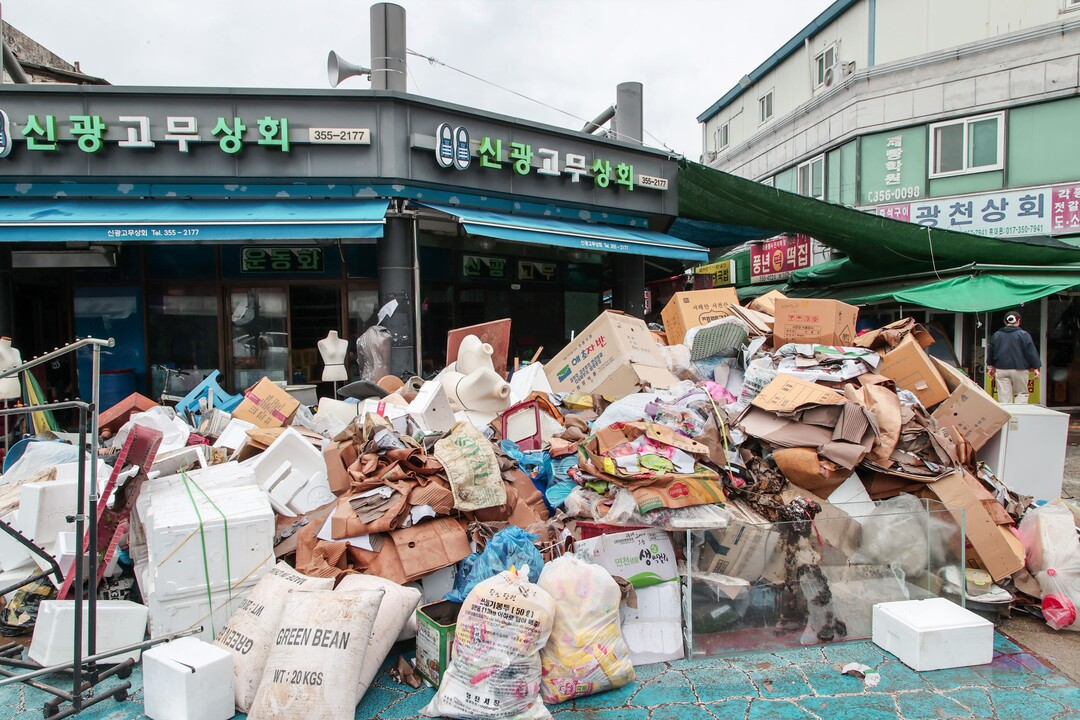 | ▲침수됐던 당진전통시장에 잔뜩 쌓인 쓰레기더미.[당진시 제공] |