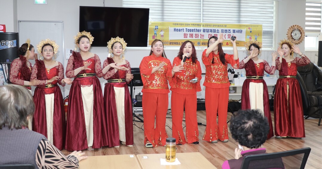| ▲ 포스코 광양제철소 프렌즈 재능봉사단이 지난달 29일 치매 어르신을 위한 경로 위안공연 행사를 진행하고 있다. [광양제철소 제공] |
