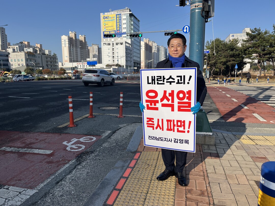 김영록 전라남도지사가 11일 아침 8시 전남도청 앞 사거리에서 '내란수괴 윤석열 즉시 파면'을 촉구하는 1인 시위에 나섰다.
