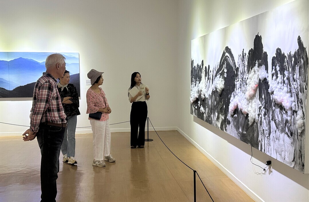 | ▲ 관람객이 도슨트의 설명을 들으며 전남국제수묵비엔날레 전시 작품을 관람하고 있다. [비엔날레사무국 제공] |