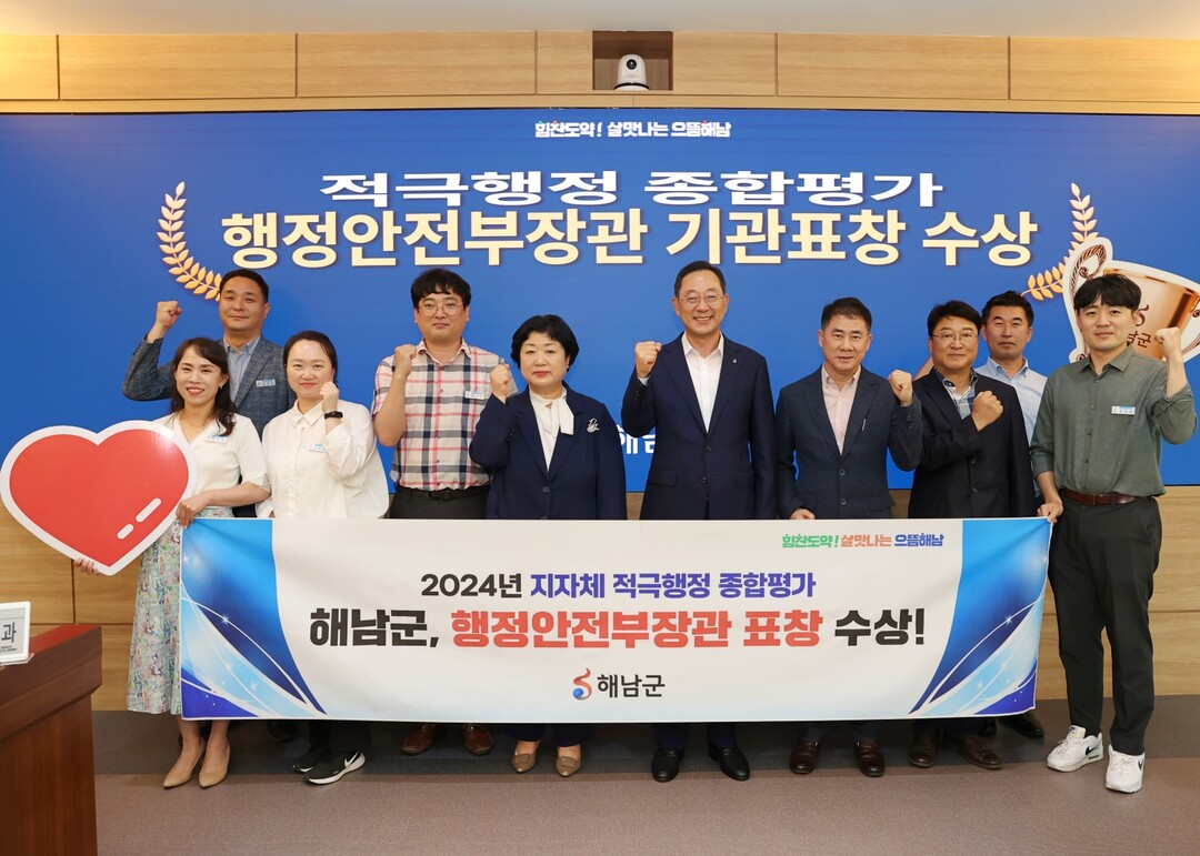 전남 해남군이 행정안전부 주관 2024년 지자체 적극행정 종합평가에서 전남 기초단체 가운데 유일하게 기관표창 수상 영예를 안았다.