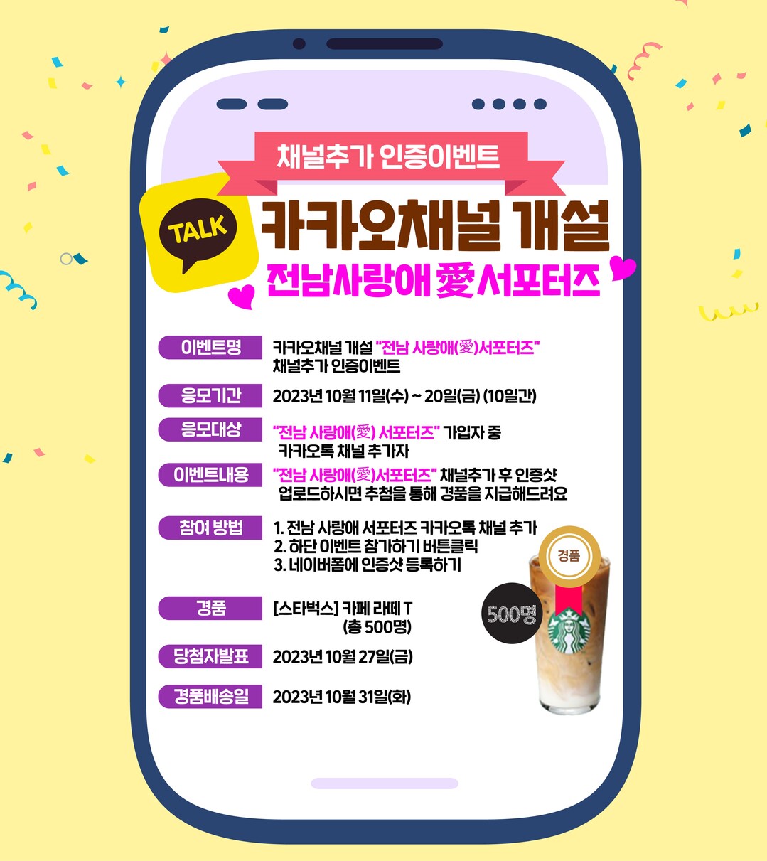 전남 사랑애 서포터즈 채널을 구독 신청하면 즉시 응모할 수 있으며, 추첨을 통해 500명을 선정해 5000원 상당의 기프티콘을 증정한다.