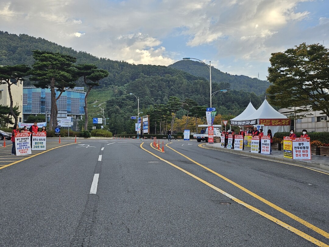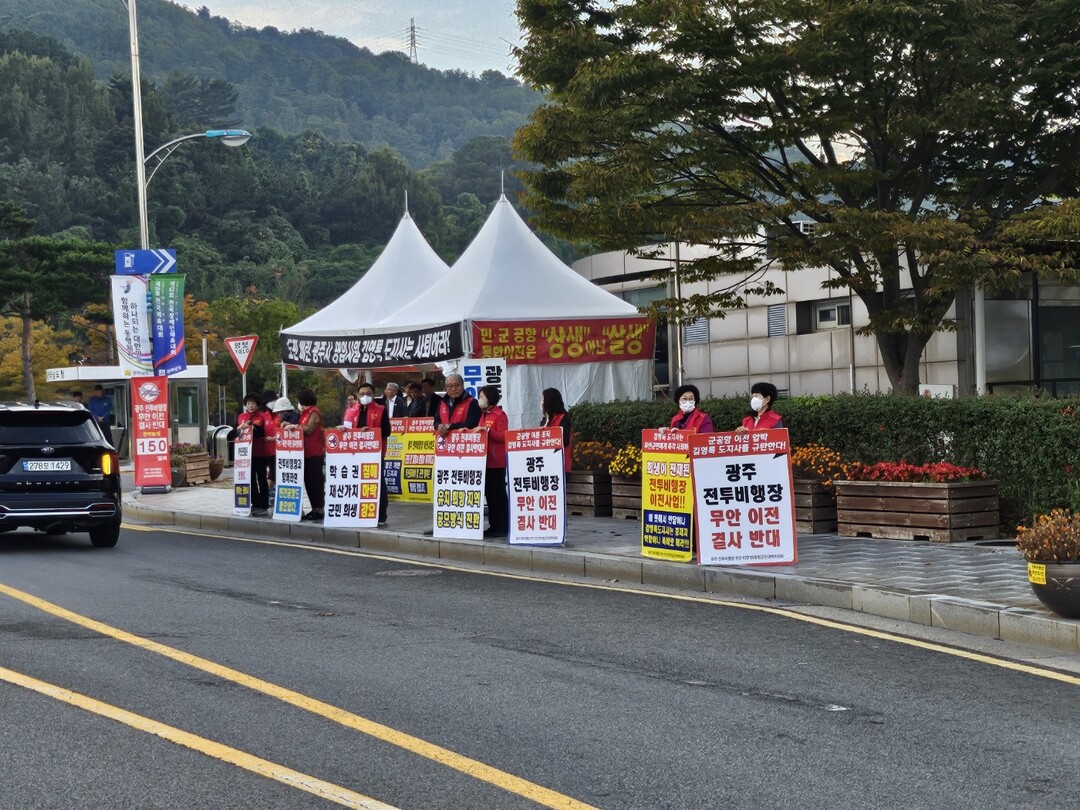 | ▲ 19일 아침 무안군 삼향읍 주민 50여 명이 광주 전투비행장 무안 이전 반대 피켓을 들고 전남도청 앞에서 집회를 하고 있다. 150일을 맞은 천막 농성에는 역대 최대 규모인 주민 50명이 모였다. [강성명 기자] |