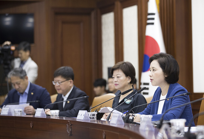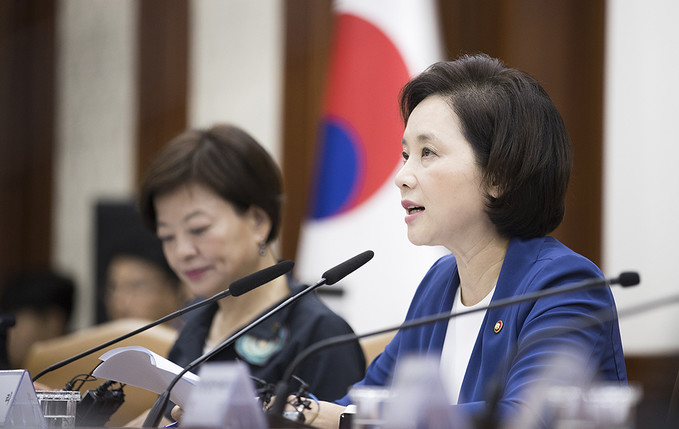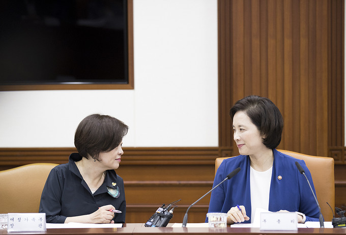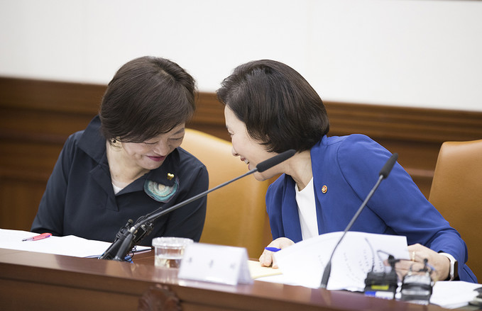 유은혜(오른쪽) 사회부총리 겸 교육부 장관과 진선미 여성가족부 장관이 9일 오전 서울 종로구 정부서울청사에서 열린 제11차 포용국가 실현을 위한 사회관계장관회의에서 대화를 나누고 있다.