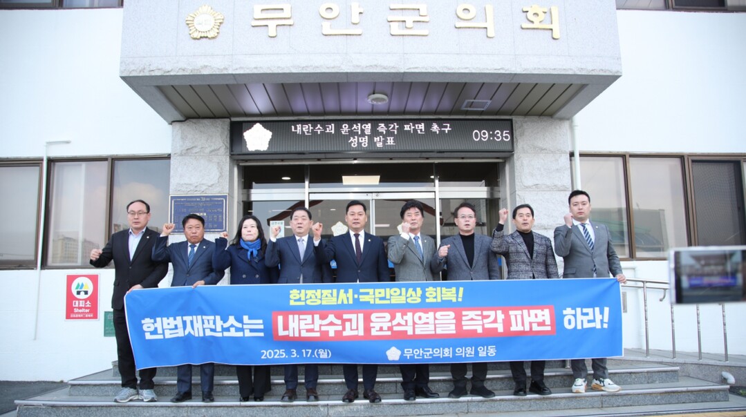 전남 무안군의회가 헌번재판소의 '내란수괴 윤석열 즉각 파면'을 촉구하는 성명서를 17일 발표했다.