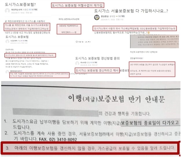 | ▲ 자영업자들이 올린 도시가스 보증보험 관련 문의글(위)과 보증보험사에서 발송하는 만기 안내문. [포털사이트 자영업자 카페 게시물 갈무리] |