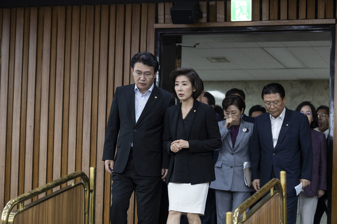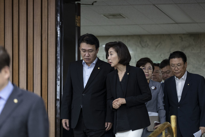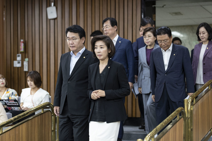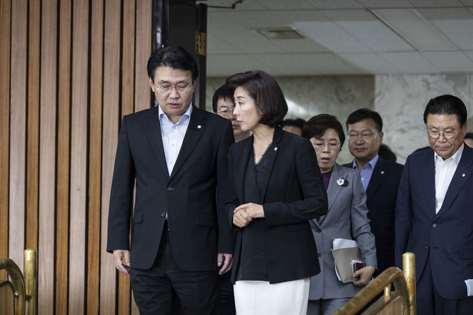 자유한국당 나경원 원내대표(오른쪽)와 정용기 정책위의장이 16일 오전 서울 여의도 국회에서 열린 원내대책회의에 참석하고 있다.