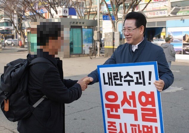 | ▲ 김영록 전라남도지사가 내란수괴 윤석열 즉시파면 팻말을 들고 목포역에서 시민들과 만나고 있다. [독자 제공] |
