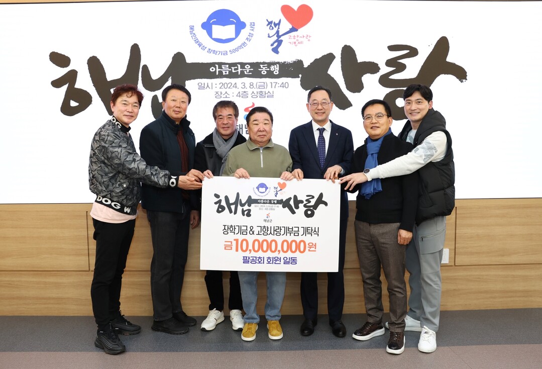 ▲ 지난 11일 '팔십까지 팔팔하게 건강하자'는 취지로 결성된 김장호(주식회사 협진 회장), 박명성(뮤지컬 감독), 선동열(야구 감독), 정보석(배우), 원기준(배우), 임금옥(해남 출신 사업가) 등 팔공회 회원 6명이 전남 해남군에 고향사랑기부제와 장학사업기금을 각각 500만 원씩 모두 1000만 원을 기탁했다. 참석자들은 "이번 기부금이 해남군에서 수학 중인 아이들이 여러 분야의 인재로 자라는 데에 쓰이기를 바란다"고 소감을 전했다. [해남군 제공] |