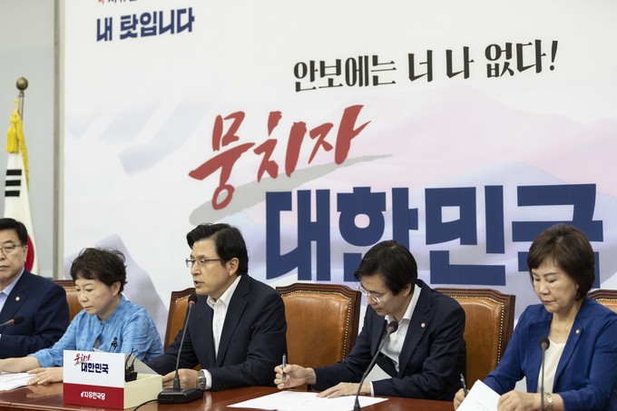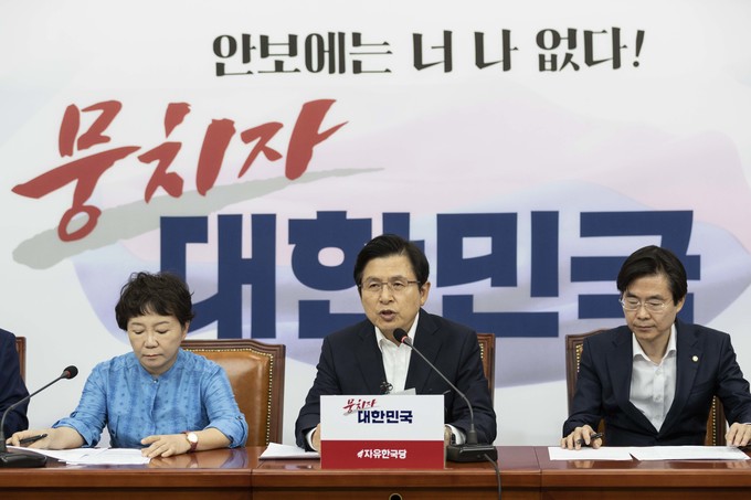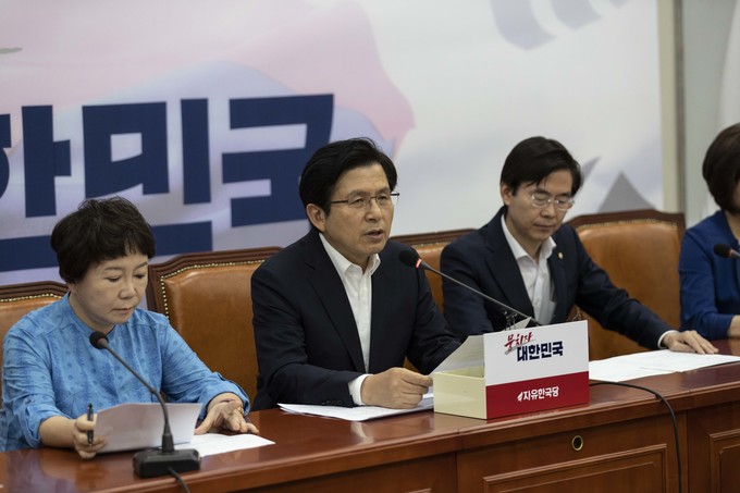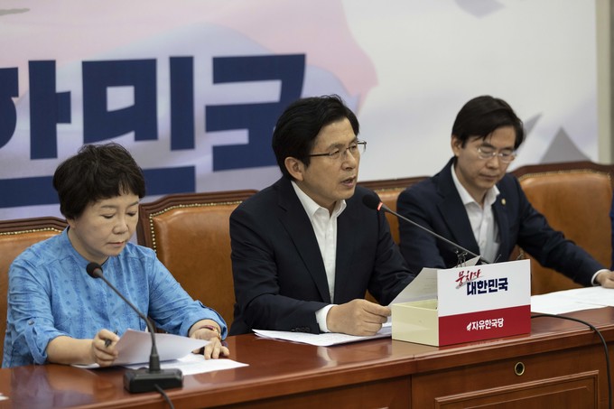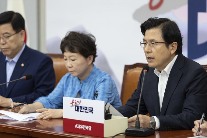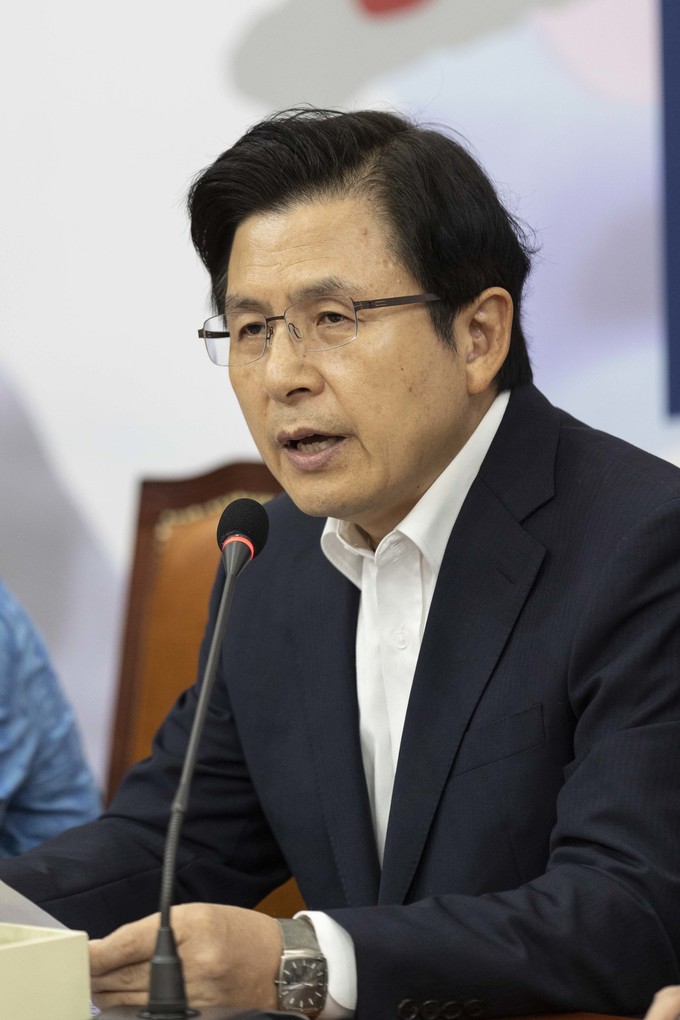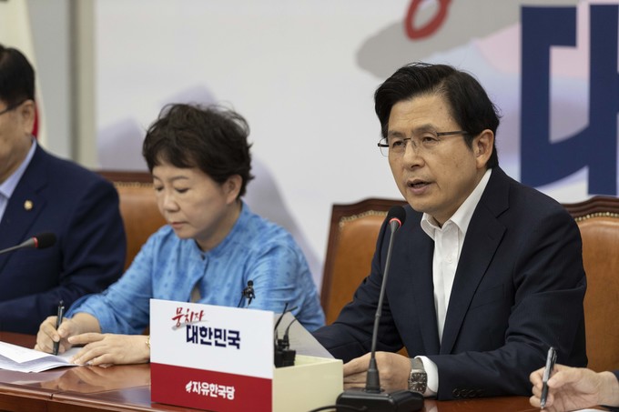 자유한국당 황교안 대표(가운데)가 12일 오전 서울 여의도 국회에서 열린 한국당 최고위원회의에 참석해 발언하고 있다.