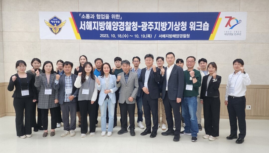| ▲ 지난 18일 서해지방해양경찰청과 광주기상청이 해양기상 전문화 공동TF팀 출범을 위한 워크숍을 진행한 뒤 기념촬영을 하고 있다. [서해해경청 제공] |