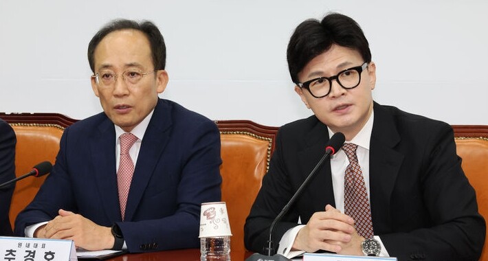 | ▲ 국민의힘 한동훈 대표가 4일 국회에서 열린 최고위원회의에서 발언하고 있다. 왼쪽은 추경호 원내대표. [뉴시스] |