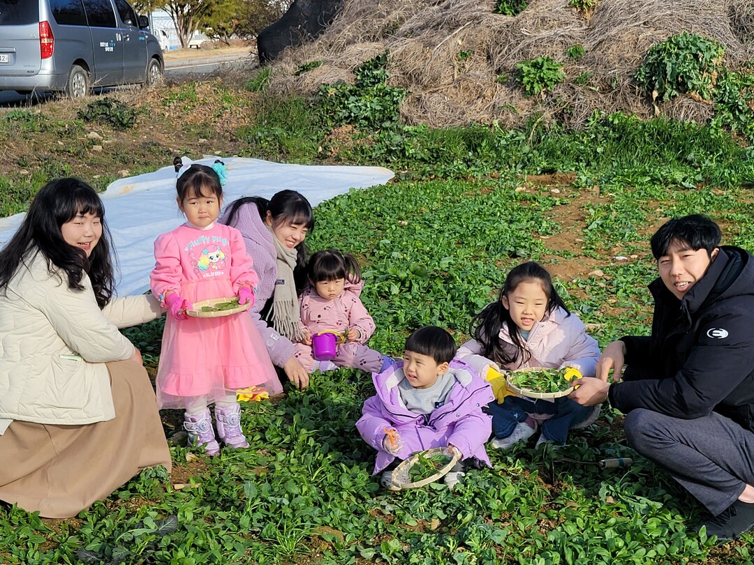 | ▲ '봄나물 캐기' 체험장에서 미취학 아동들이 봄나물을 캐고 있다. [강진군 제공] |