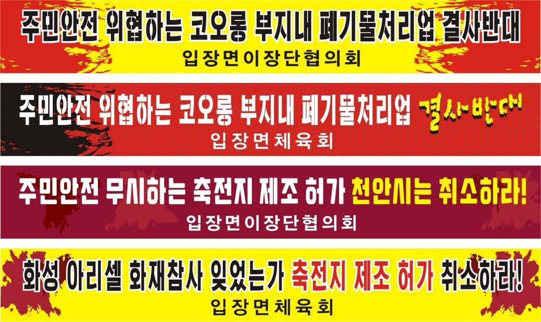 | ▲천안 입장 일대에 부착한 폐기물처리업체 허가 결사반대 현수막.[KPI뉴스] |