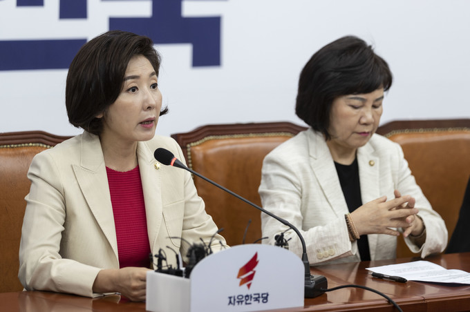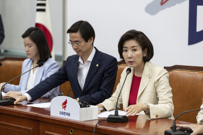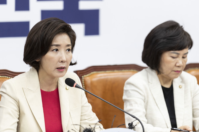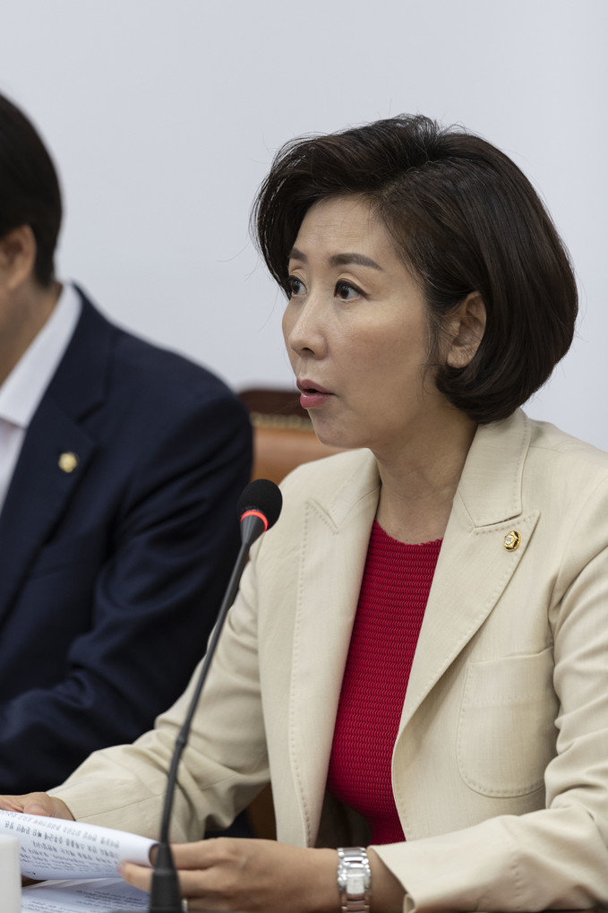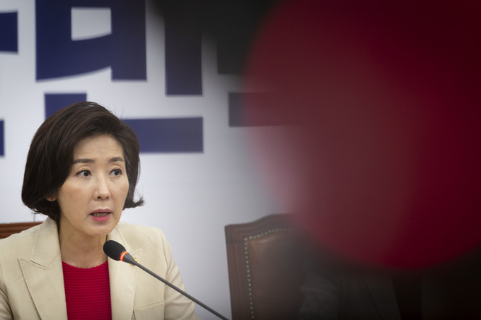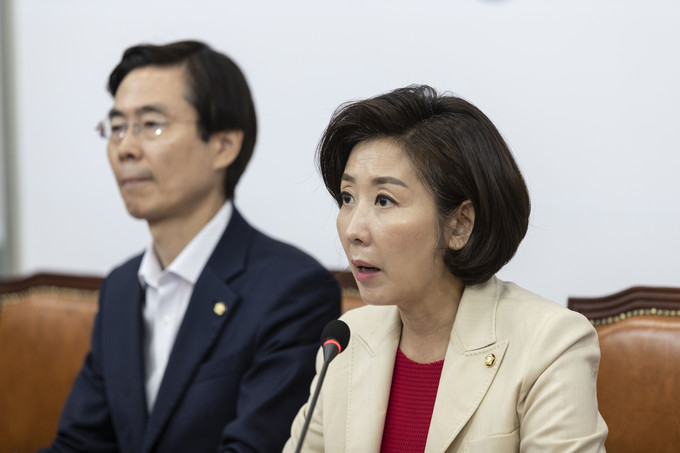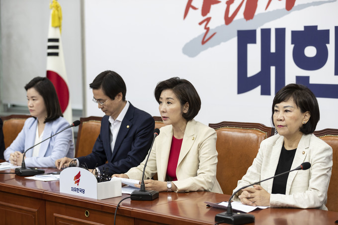 자유한국당 나경원 원내대표(왼쪽 세번째)가 29일 오전 서울 여의도 국회에서 열린 한국당 최고위원회의에 참석해 발언하고 있다.