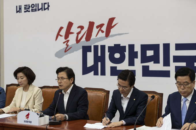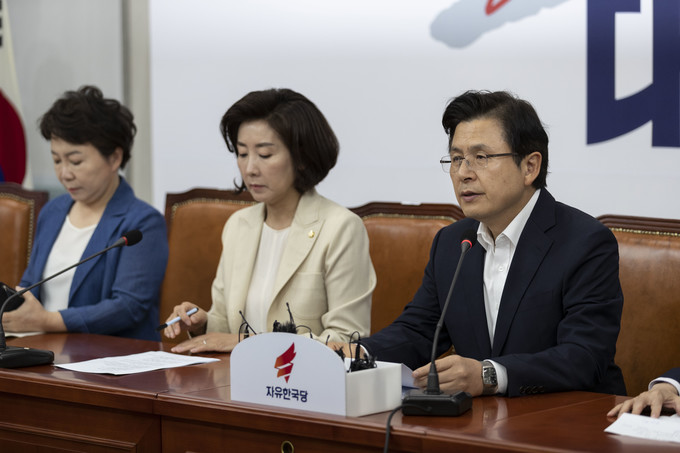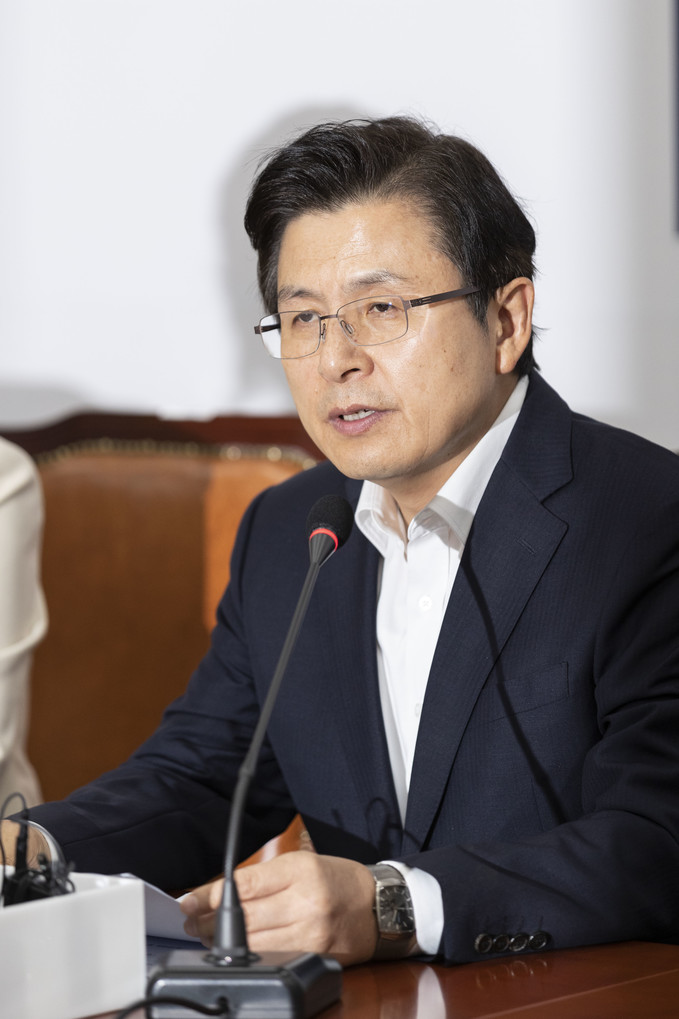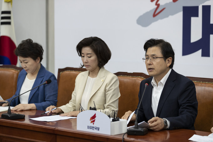 자유한국당 황교안 대표(오른쪽)가 11일 오전 서울 여의도 국회에서 열린 한국당 최고위원회의에 참석해 발언하고 있다.
