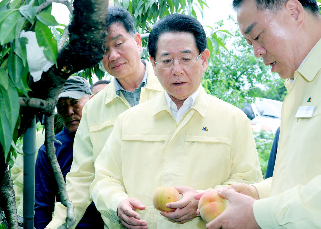 | ▲ 김영록 전라남도지사가 지난 7월 24일 화순 복숭아 낙과 피해농장을 방문해 구복규 화순군수로부터 피해에 대한 설명을 듣고 있다. [전남도 제공] |