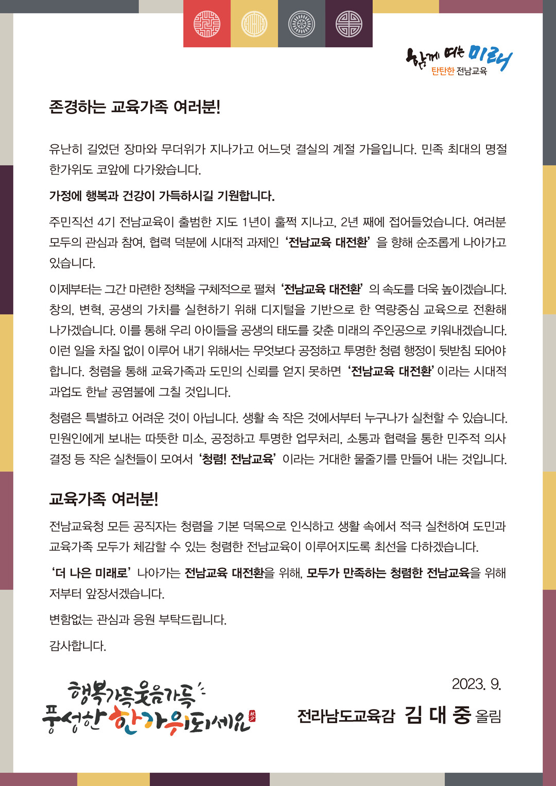 아울러 "더 나은 미래로 나아가는 전남교육 대전환을 위해 모두가 만족하는 청렴한 전남교육을 위해 저부터 앞장서겠다"며 추석 명절 인사를 마무리 했다.