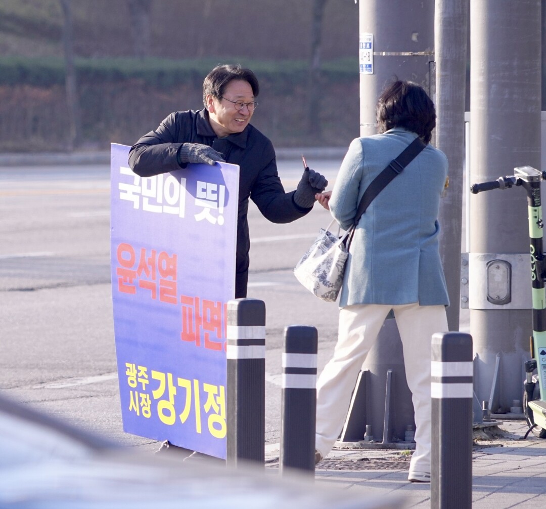 | ▲ 강기정 광주광역시장이 11일 아침8시 시청 앞 5·18기념공원 교차로에서 '윤석열 파면' 피켓을 들고 1인 시위에 나서는 중 출근하는 시민들과 인사를 나누고 있다. [강기정 광주시장 제공] |