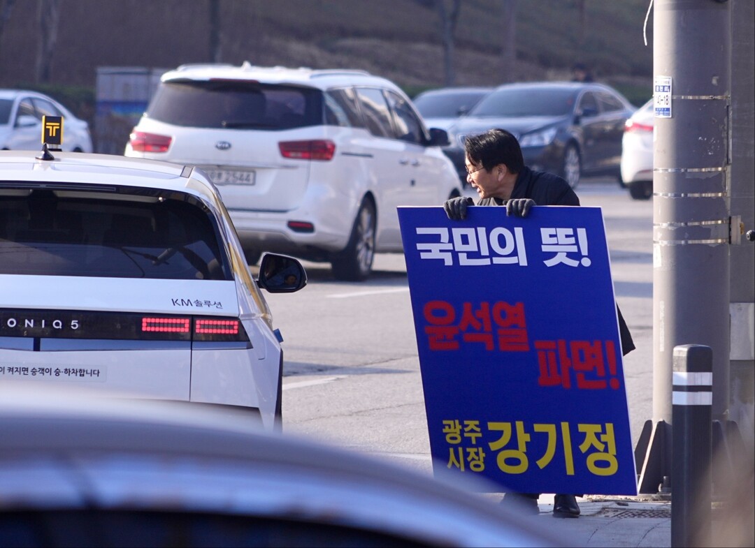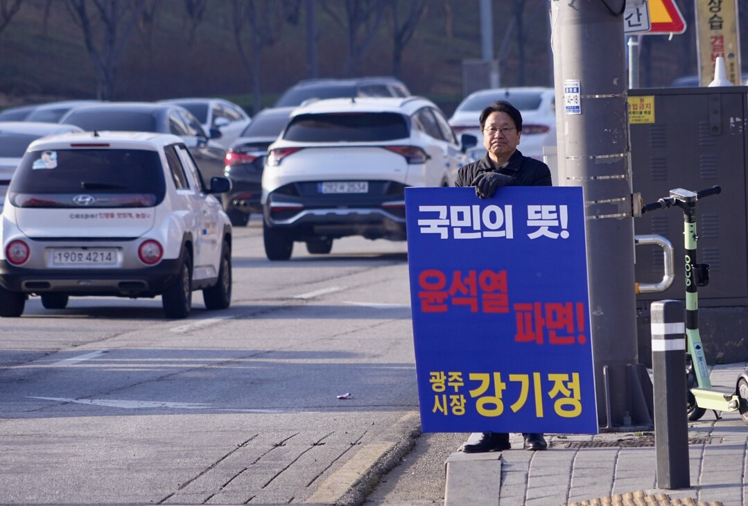 | ▲ 강기정 광주광역시장이 11일 아침8시 시청 앞 5·18기념공원 교차로에서 '윤석열 파면' 피켓을 들고 1인 시위에 나서고 있다. [강기정 광주시장 제공] |