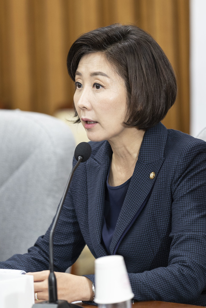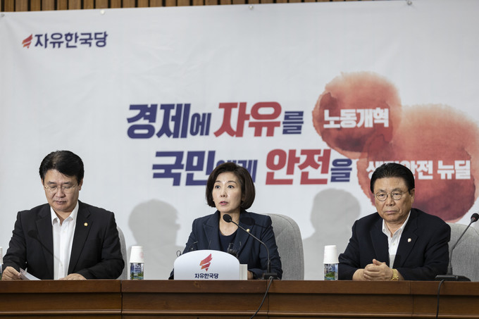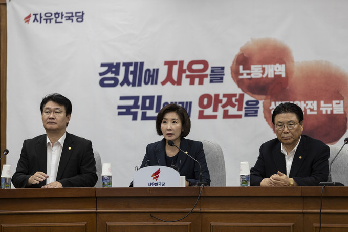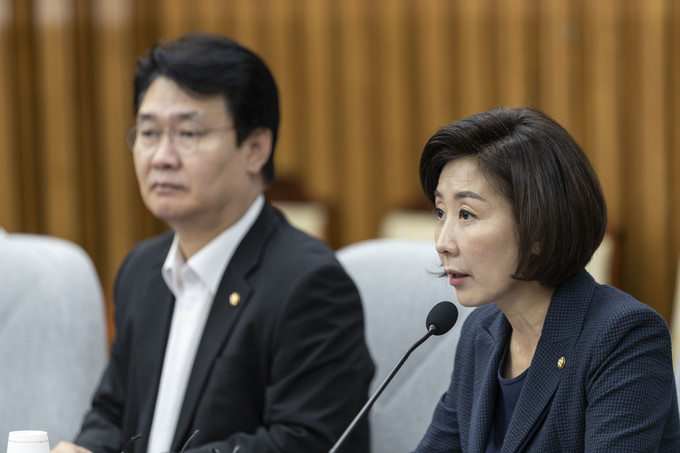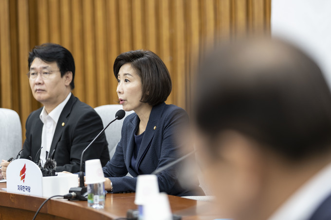 자유한국당 나경원 원내대표(오른쪽)가 30일 오전 서울 여의도 국회에서 열린 한국당 원내대책회의에 참석해 발언하고 있다.