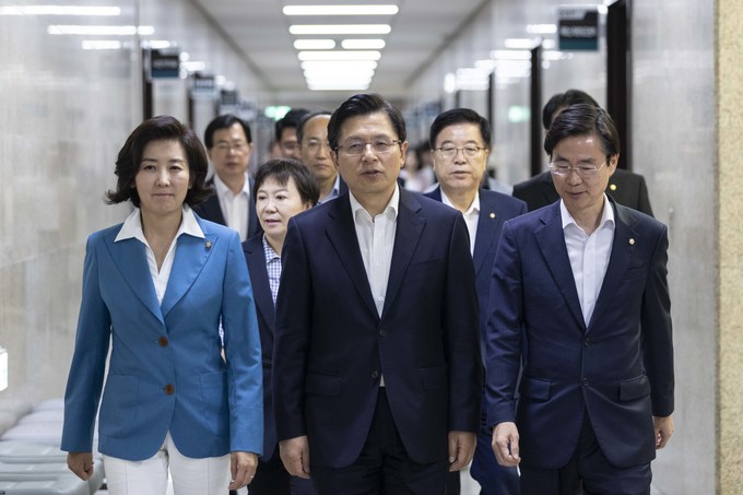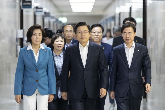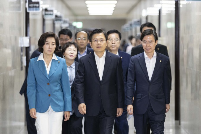 자유한국당 황교안 대표(가운데)와 나경원 원내대표가 29일 오전 서울 여의도 국회에서 열린 한국당 최고위원회의에 참석하고 있다.