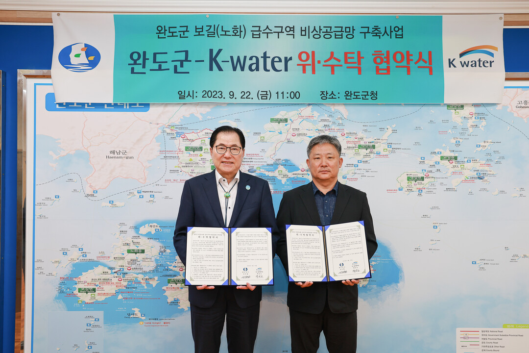 전남 완도군이 한국수자원공사 영·섬유역본부와 지난 22일 ‘완도군 보길·노화 급수 구역 비상 공급망 구축 사업’ 시행을 위한 위수탁 협약을 체결했다.