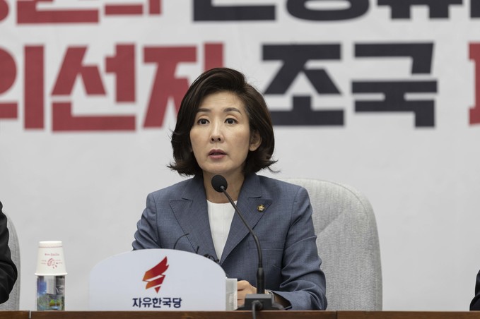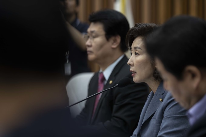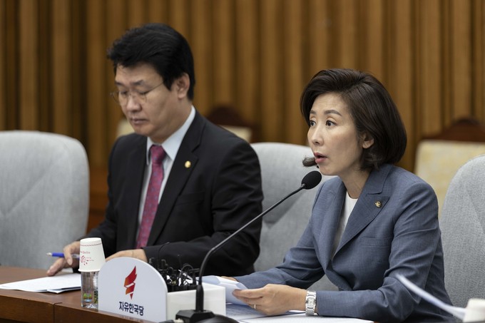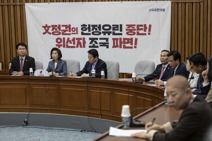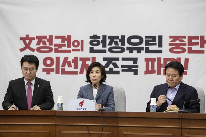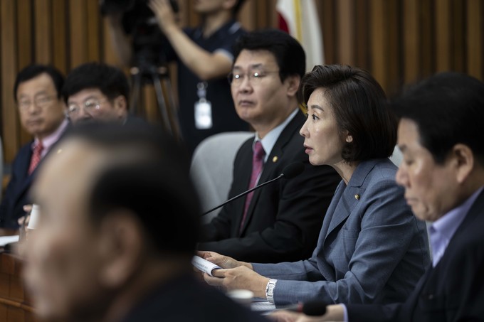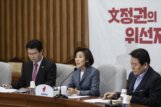 자유한국당 나경원 원내대표(가운데)가 17일 오전 서울 여의도 국회에서 열린 한국당 원내대책회의에 참석해 발언하고 있다.