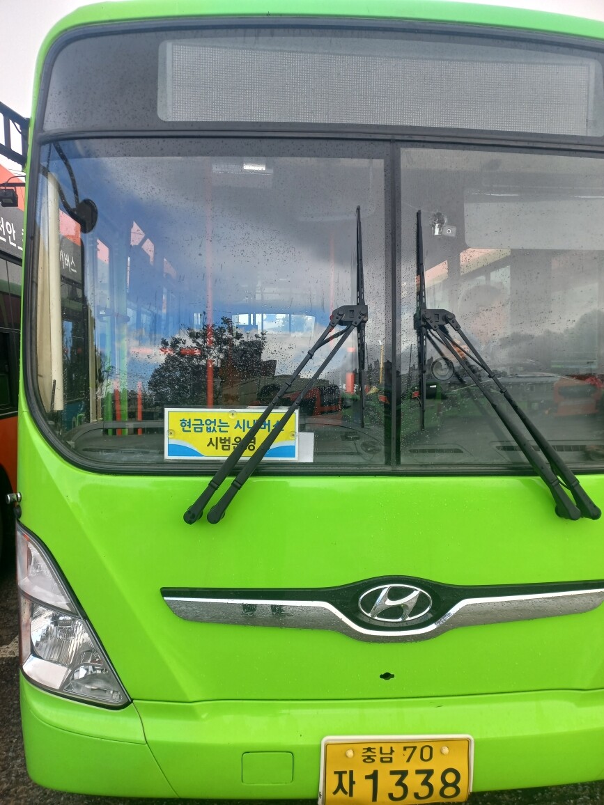 | ▲현금없는 시내버스 시범운영 안내문 부착한 시내버스.[천안시 제공] |