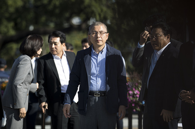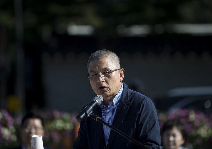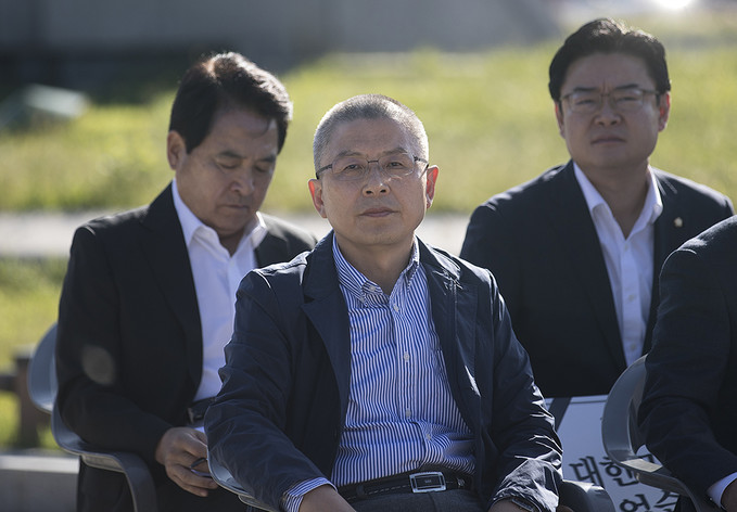 황교안 자유한국당 대표가 18일 오전 서울 종로구 청와대 분수대 앞에서 열린 최고위원-중진의원 연석회의에 참석하고 있다.