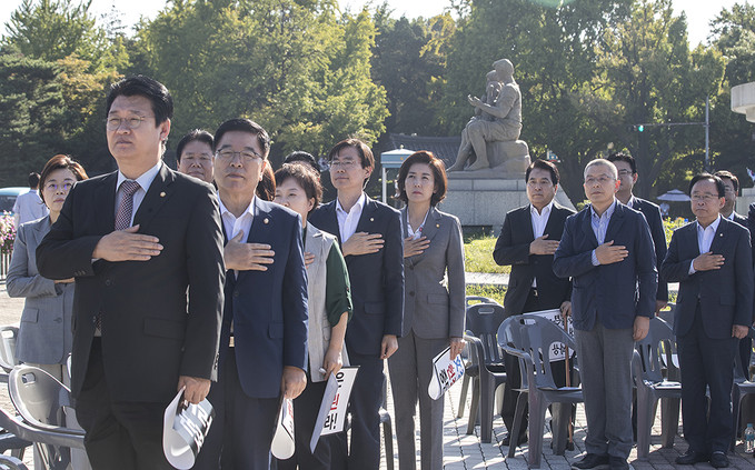 황교안 자유한국당 대표 및 당 지도부가 18일 오전 서울 종로구 청와대 분수대 앞에서 열린 최고위원-중진의원 연석회의에서 국민의례를 하고 있다.