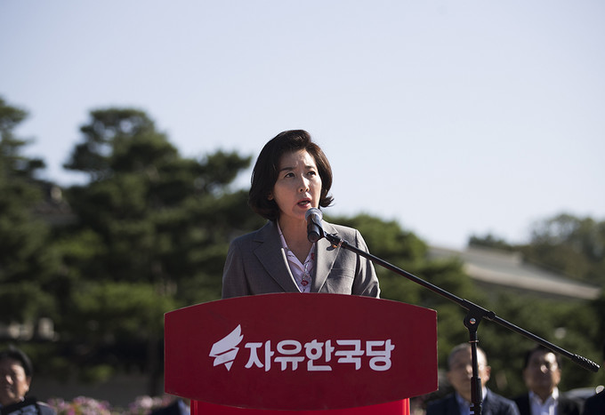 나경원 자유한국당 원내대표가 18일 오전 서울 종로구 청와대 분수대 앞에서 열린 최고위원-중진의원 연석회의에서 모두발언을 하고 있다.