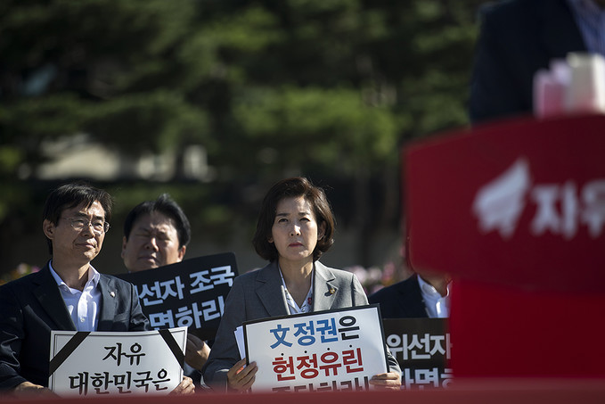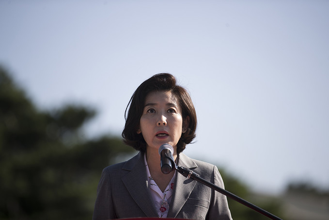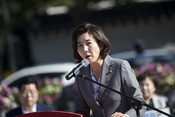 나경원 자유한국당 원내대표가 18일 오전 서울 종로구 청와대 분수대 앞에서 열린 최고위원-중진의원 연석회의에서 황교안 당대표의 말을 듣고 있다.