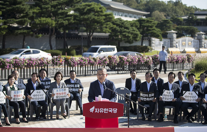 황교안 자유한국당 대표가 18일 오전 서울 종로구 청와대 분수대 앞에서 열린 최고위원-중진의원 연석회의에서 모두발언을 하고 있다.