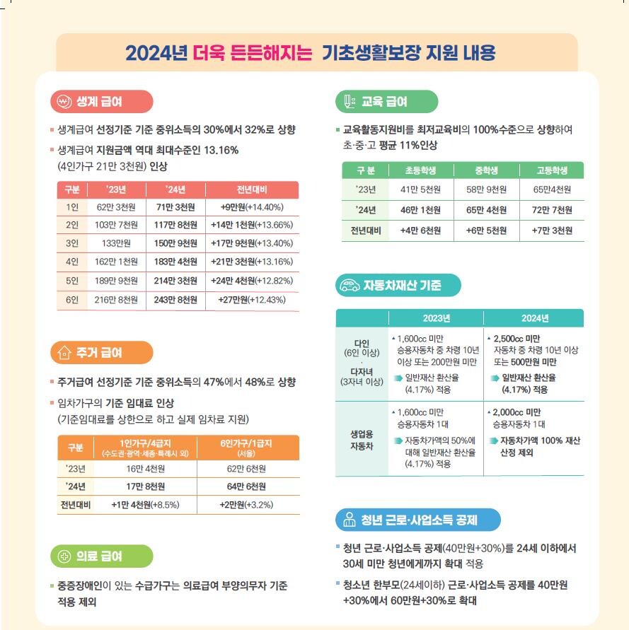 7일 대전시에 따르면 생계급여 선정 기준 중위소득(30%→32%)과 주거급여(47%→48%)가 상향되면서, 생계 급여의 경우 4인 가구 기준 2023년 162만 원에서 2024년 183만 원으로 21만 3000원 증가해 전년 대비 13.16% 인상 지원한다.