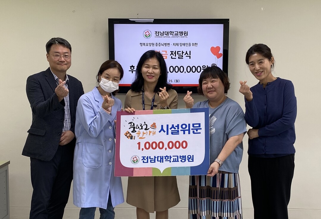 전남대병원 차은경 총무과장, 이정연 총무팀장 등은 지난 26일 광주 동구에 위치한 중증장애인 복지시설인 행복요양원을 방문해 성금 100만 원을 전달했다.