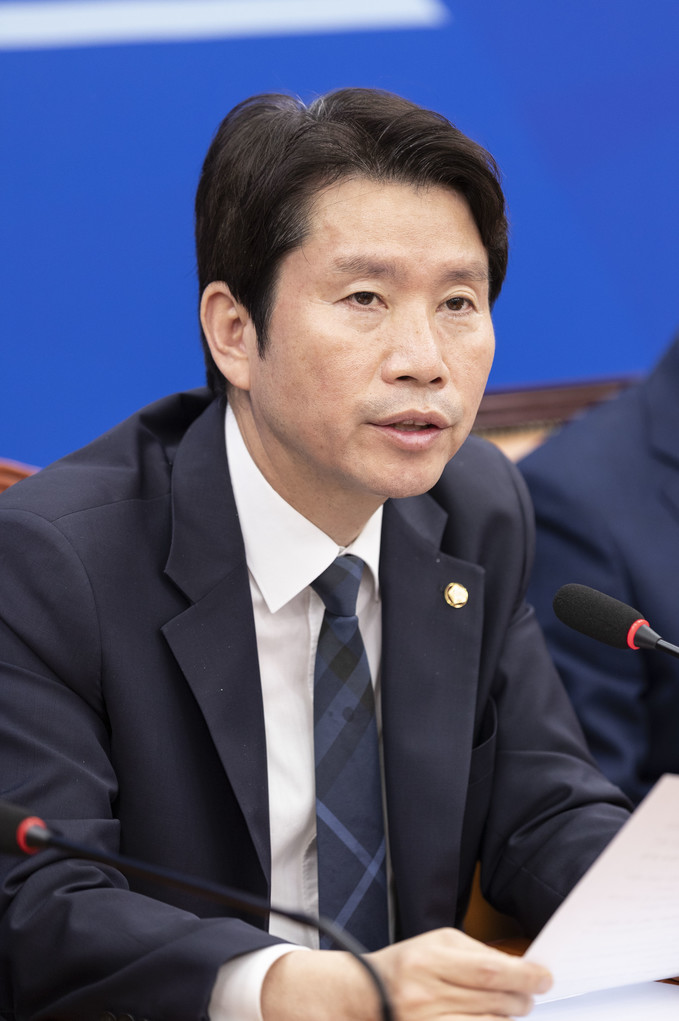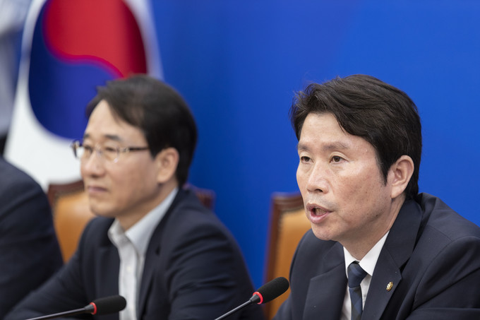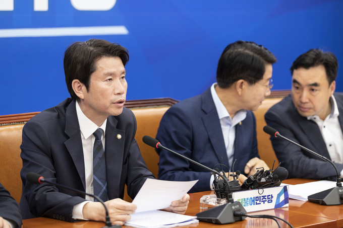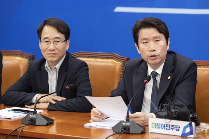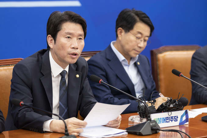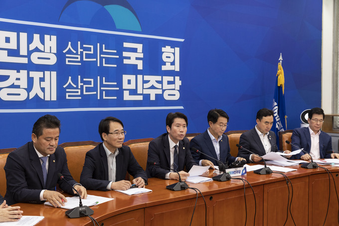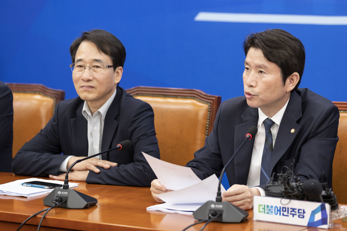 더불어민주당 이인영 원내대표(오른쪽)가 11일 오전 서울 여의도 국회에서 열린 민주당 정책조정회의에 참석해 발언하고 있다.